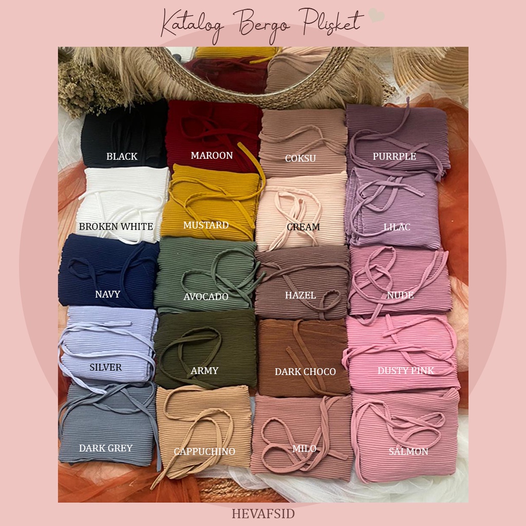 Produk ini memiliki 24 Variasi Bergo Plisket yaitu :