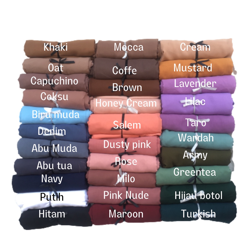Produk ini memiliki 30 Variasi Warna yaitu : Abu Muda,Abu Tua,Biru Muda,Brown,Coffee,Coksu,Cream,Denim,GreenTea,Hijau Botol,Hitam,Lavender,Lilac,Maroon,Milo,Mocca,Nude,Pink Nude,Putih,Salem,Taro,Turkish,Wardah,Army,Dusty Pink,Honey Cream,Oat,Rose,Mustard,Navy,